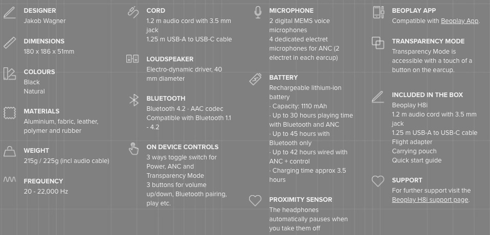 ตัว Beoplay H8i นั้นถึงแม้จะมีขนาดเล็กกว่ารุ่น H9i และไม่มีการควบคุมด้วยการสัมผัส แต่ว่ามาพร้อมกับแบตเตอรี่ขนาดใหญ่กว่า ทำให้สามารถใช้งานได้นานสูงสุดถึง 30 ชั่วโมงเลยทีเดียวครับ นอกจากนี้ฟังก์ชั่นต่างๆก็อัพเกรดมาจากรุ่น H8 เดิมครับ ได้แก่การปรับจูนเสียงของไดร์เวอร์ใหม่ให้ดียิ่งกว่าเดิม, เปลี่ยนช่อง USB สำหรับชาร์จจาก Micro USB เป็น USB-C, ปรับแต่งระบบตัดเสียงรบกวนใหม่ให้มีประสิทธิภาพดียิ่งกว่าเดิม, และเพิ่มไมโครโฟนสำหรับโทรศัพท์เข้ามาอีกหนึ่งตัว ช่วยให้สามารถโทรศัพท์ได้อย่างคมชัดครับ เรียกได้ว่าภายในนี่อัพเกรดแทบทั้งสิ้นเลยครับ