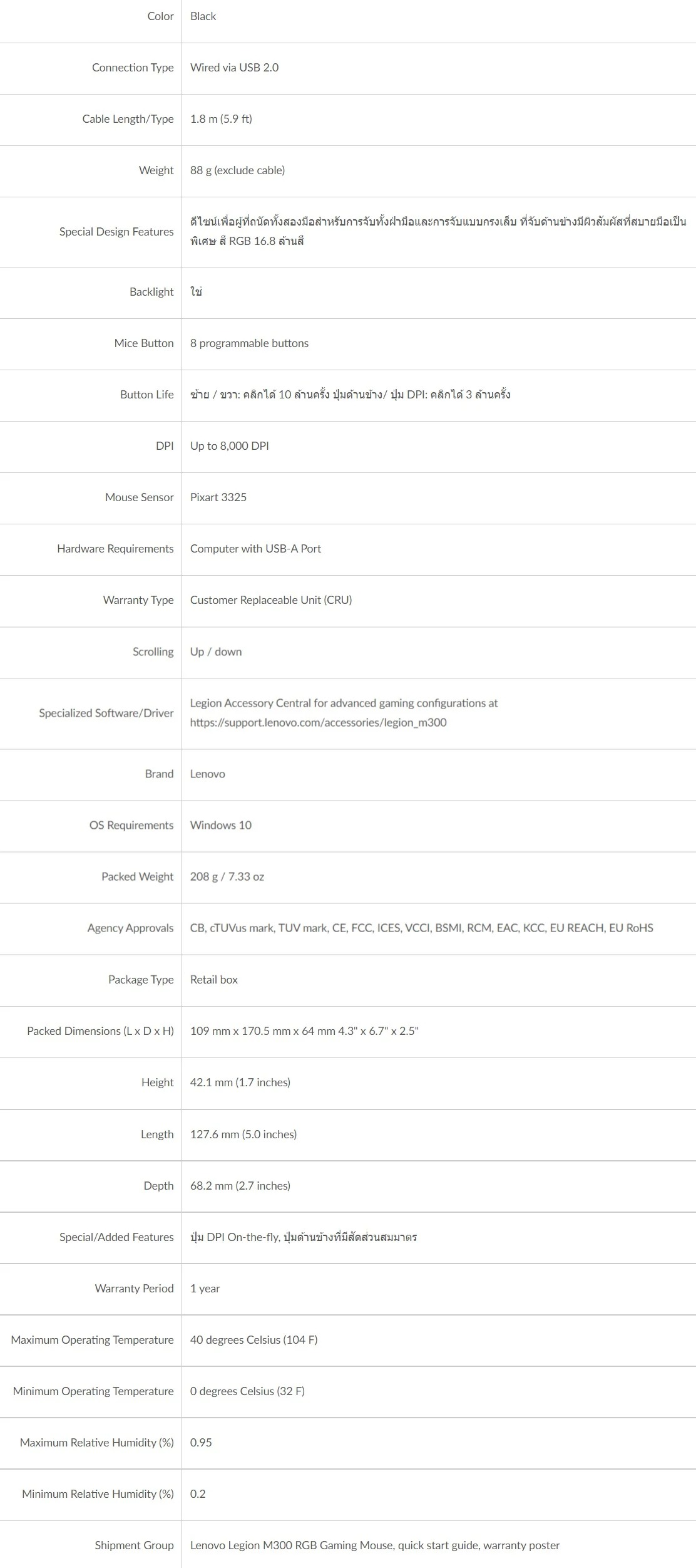 Lenovo Legion M300 RGB Gaming Mouse มอบประสิทธิภาพ ความสะดวกสบาย และการควบคุมที่นักเล่นเกมมือใหม่ไฟแรงต้องการเพื่อเล่นได้อย่างมืออาชีพ สมกับเป็นคู่หูที่ไว้ใจได้ ด้วยการออกแบบตามหลักการยศาสตร์สำหรับผู้ที่ถนัดทั้งสองมือ มีปุ่มที่ตั้งโปรแกรมได้ได้ง่ายๆ 8 ปุ่ม เซ็นเซอร์ที่ปรับความละเอียดได้ 8,000 DPI ที่แม่นยำเป็นพิเศษ และไฟพื้นหลัง LED แบบ RGB บนโลโก้ Legion ที่โดดเด่น