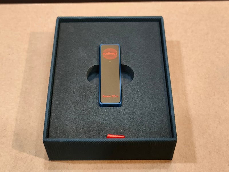 ในส่วนของการออกแบบนั้น Audirect Beam 3S เป็น DAC/Amp ขนาดเล็ก ทรงสี่เหลี่ยมผืนผ้า ตัวเครื่องมาในสีน้ำเงิน ตัดกับสีดำที่ด้านหน้าและหลัง โดยมีโลโก้ Audirect และชื่อรุ่น Beam 3S สีแดง ที่ด้านบนจะเป็นช่อง USB-C สำหรับเชื่อมต่อ ส่วนด้านล่างจะเป็นแจ๊คหูฟังขนาด 4.4 มม. และที่ด้านข้างจะมีปุ่มสำหรับปรับระดับ Gain เพื่อให้เหมาะสมกับหูฟังที่ใช้งานอยู่ด้วย