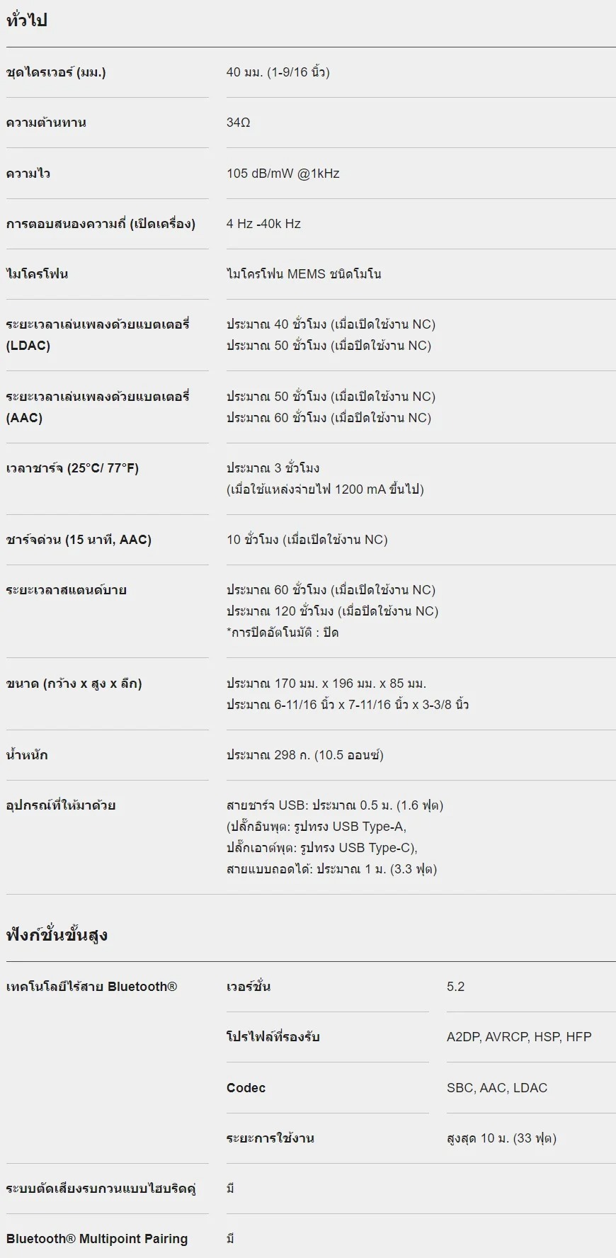 *ข้อมูล ณ วันที่ 31 ต.ค. 2021 จากงานวิจัยโดย Panasonic Corporation ซึ่งอ้างอิงจากเวลาการเล่น (เมื่อเปิดใช้งาน AAC, NC) ในตลาดหูฟังตัดเสียงรบกวนแบบครอบหู