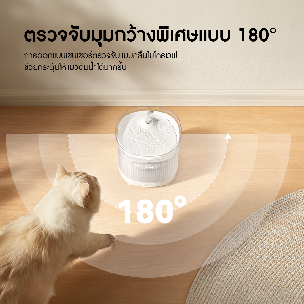 • โหมดตอบสนอง: เมื่อเซนเซอร์จับได้ว่ามีความเคลื่อนไหวใกล้เข้ามา น้ำพุจะปล่อยน้ำออกมา 1 ครั้ง และมีน้ำพร้อมดื่ม 70 มิลลิลิตรอยู่ตลอดเวลา **ตัวเครื่องจะเข้าสู่โหมด Sleep เป็นเวลา 15 วินาทีหลังการปล่อยน้ำ 1 ครั้ง และหากไม่มีการปล่อยน้ำเลยเป็นเวลา 2 ชั่วโมง เครื่องจะปล่อยน้ำออกมา 1 ครั้ง**