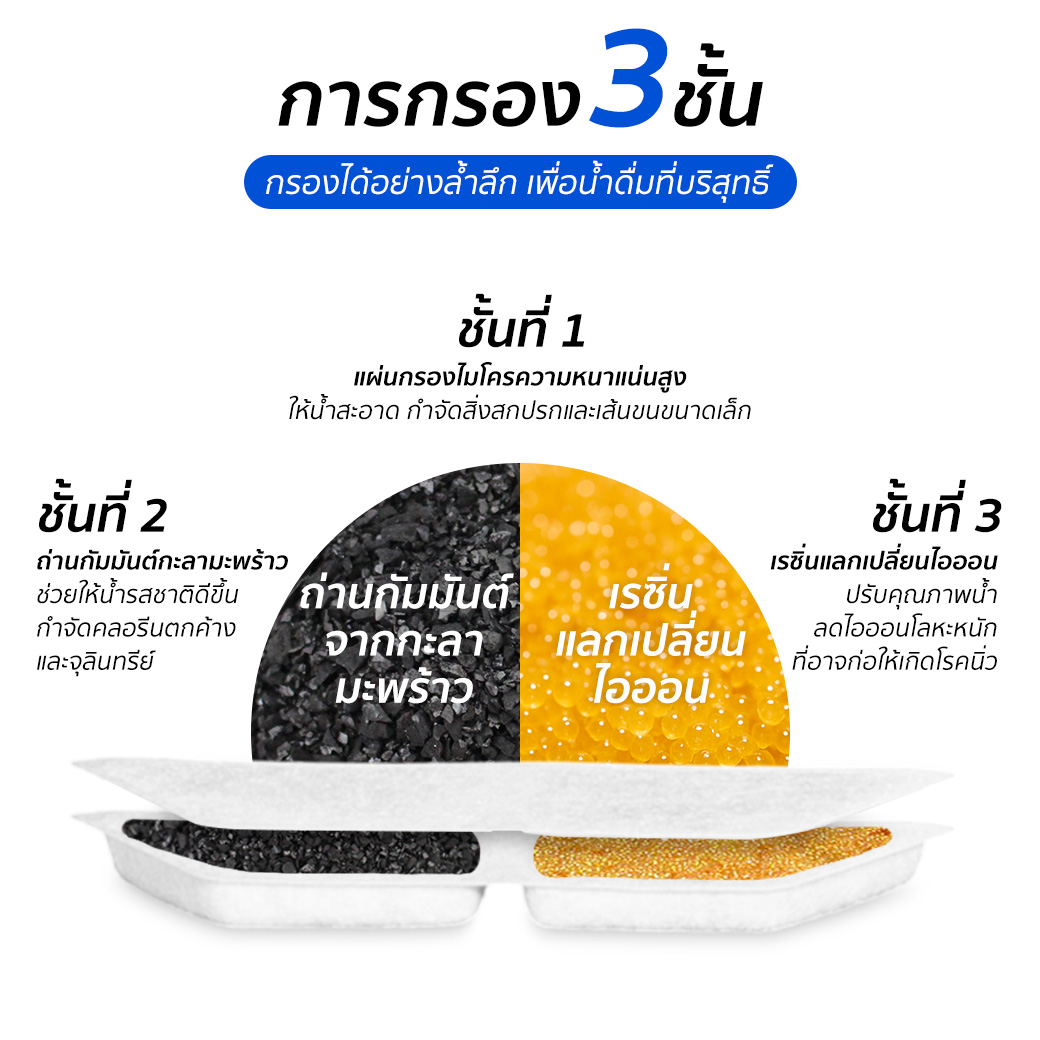 - ชั้นสองถ่านกัมมันต์จากกะลามะพร้าว: ช่วยขจัดคลอรีนตกค้าง และกลิ่นไม่พึงประสงค์ ทำให้น้ำมีรสชาติที่ดีกว่า